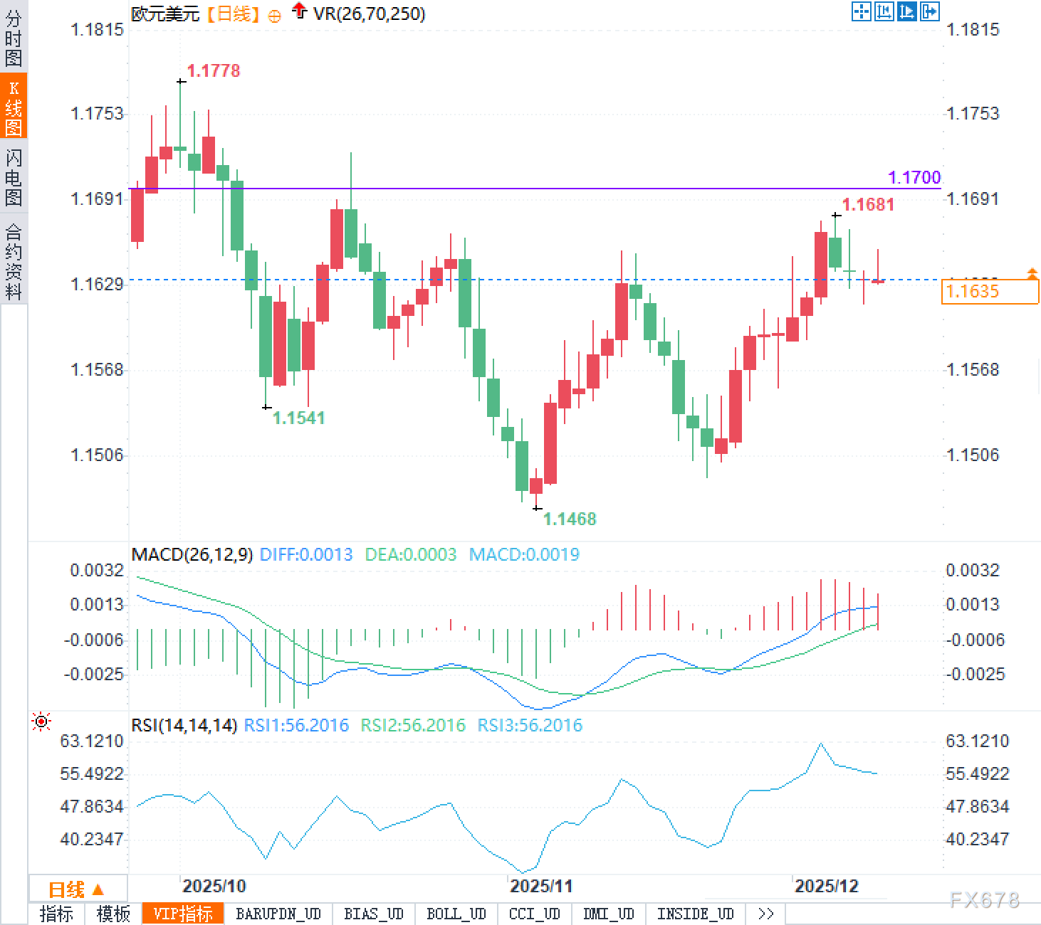 汇通财经APP讯——周二(12月9日),欧元兑美元在1.1650一线受阻后回落,北美时段围绕1.1635交投。短线节奏呈现“上攻乏力、回撤不深”的犹豫状态,市场更愿意在关键事件落地前压缩仓位与杠杆,等待方向性信号出现。
